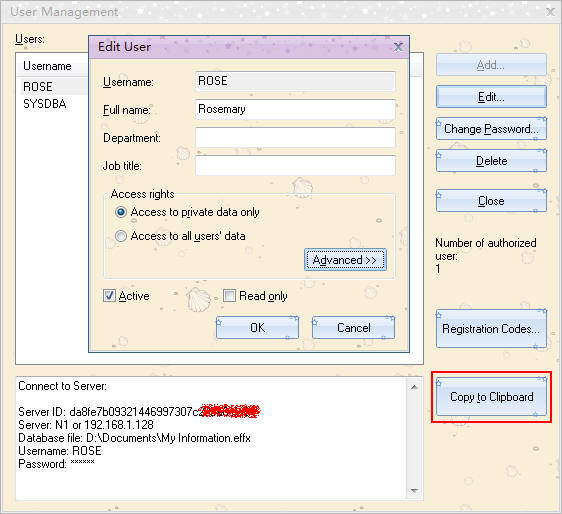 - If you have inputted the correct information, you can connect to server as administrator successfully. So you can add your group members by clicking Users on File menu. (If you select Access to private data only, he or she will not see others' information.) When you add a new member and select that entry, you can see the related information about connecting to server. And you can copy it by clicking Copy to Clipboard button in this interface. Hence, it is really convenient for you to send it to the user.