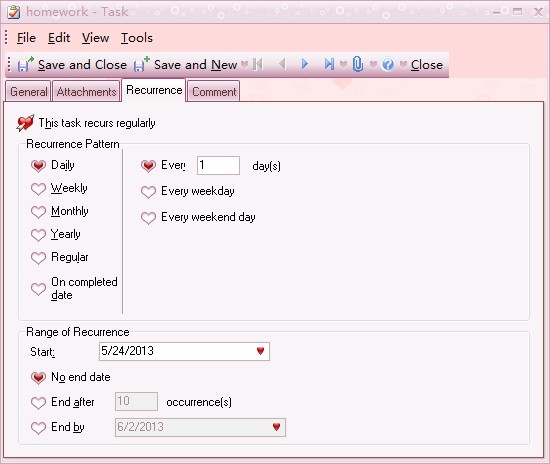 - If the event or task recurs regularly, you can set its recurrence pattern according to the requirements. In addition, you can mark the label and add some related comments or attachment about them as well.