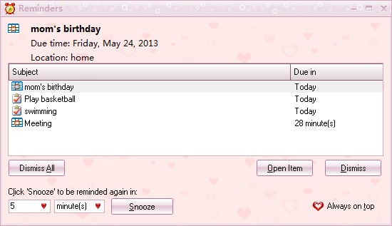 Besides, our software will remind you before the deadline of an event or a task based on the time you set. (Tasks can be reminded before the start date.) You can click Reminders Window on the View menu to display the Reminders window at any time.