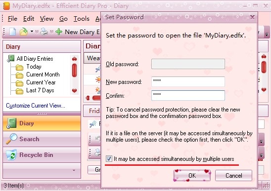 - After you install Efficient Diary Server on the server computer, Efficient Diary will create a database file and connect to server automatically. (By default, the directory of database file is "C:\Documents and Settings\your user name\My Documents\MyDiary.edfw" )
