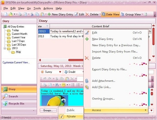 - Also you can change the access rights of an entry. Please right-click this entry and click Access in the popup menu. If you select Private, this entry will be seen just by you, administrator and the one whose access rights is to all users' data.