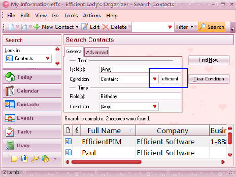 - When you want to aftertaste your past, you can find them quickly on the top of navigation panel. Or you can click Search button on the navigation panel to enter the Search module. After you input any information about the diary entry in the text box of Condition, our software will present the related diary entries for you.