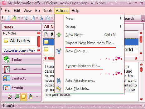 - After go to the Notes module, you cannot only write down your new ideas or copy and paste some useful information from internet just as Word, but also import RTF files or text files into the note. Please click Import New Note from File on the Actions menu if you have some before. In addition, you can add some related attachments about it when edit a note.