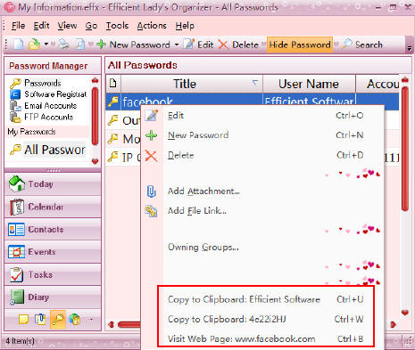 In short, Efficient Lady's Organizer is a powerful and easy-to-use program which aims to offer you a more efficient and happier life style. And you can know more detailed information about Efficient Lady's Organizer Network Guide.