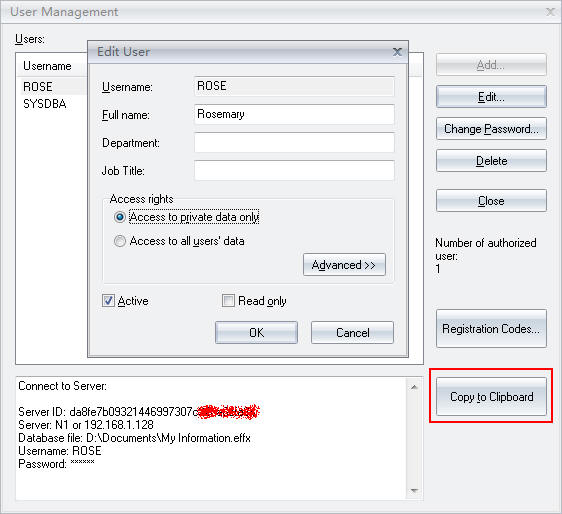 - Select one new account, you will see the related information about connecting to server. Then click Copy to Clipboard button and send the info to that user. (Note: password will not be displayed for privacy.) When the number of authorized user is full, the Add button will be disabled. If you want to add a new user, please purchase another license on our official website. And then click Registration Codes button to input it and to add again.