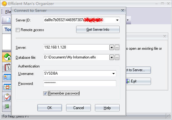 - Start Efficient Man's Organizer and click File -> Connect to Server.