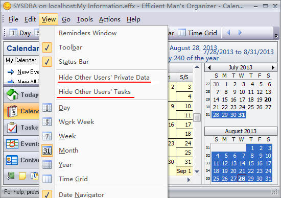 - If you are a super user (whose access rights is access to all users' data), you can click View -> Hide Other Users' Private Data. But after you enter Calendar Module, you can see each user's calendar view separately without setting Hide Other Users' Private Data.