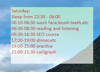 1.Early to bed and early to rise. Right now many young people like to sleep late and get up late. And I was one of them, always went to bed around 2 am and got up at 10, and every time I followed this schedule, I felt very tired the next day and could not do anything efficiently. After I realized I could not continue this kind of life then and made a new schedule of the bed and wake time, everything seems to be much better.