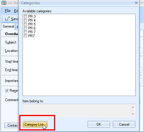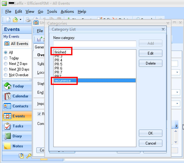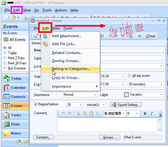 After opening Efficient Software, and when adding a new contact, event, task, diary, note, sticky note, password, website, or editing one already in the list, we can click ‘Edit’, select ‘Belong to Categories’ as shown below and then set the category. (Tips: Note that ‘Edit’ is the secondary Edit option on the Task form, not the Edit option on the home page that we saw when the software opened). So you select Edit on the Home Page, then Edit (Ctrl+O) again from the option list then select Edit again from the Task form.