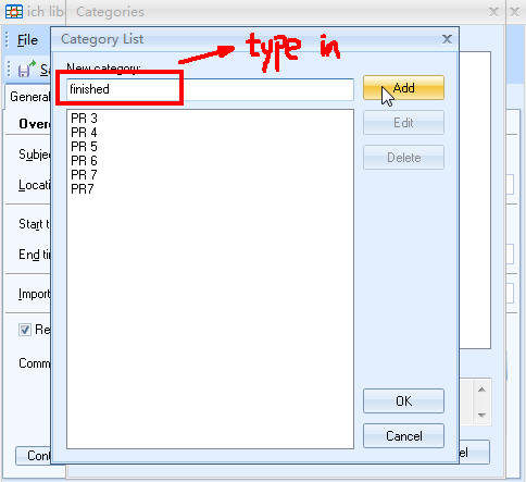 Then type in ‘finished’ (it means that the event has completed, of course we can type in any words that we like to replace it, for example, we can type in ‘recurrent event’ ). Next click ’Add’, then go back to last window to assign this event to ‘finished’.