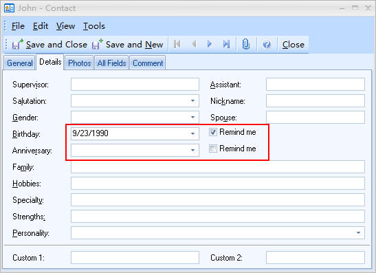 After you enter the Contacts Module, please click New Contact to enter contact-editing window. Firstly, click Details Tab. And then click the drop-down menu of Birthday/Anniversary to set the date of your contact's birth. At last, select Remind me.