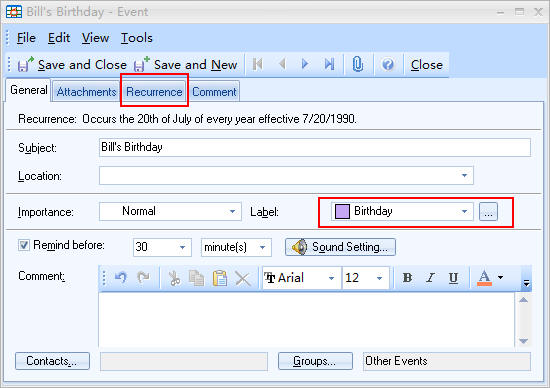 - Please click Recurrence in the event-editing window to set this event occurs yearly. After that, the reminder window will display the age of his/her birthday.