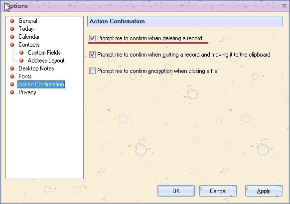 Please click Options on the Tools menu, and then select Prompt me to confirm when deleting a record in the Action Confirmation section.