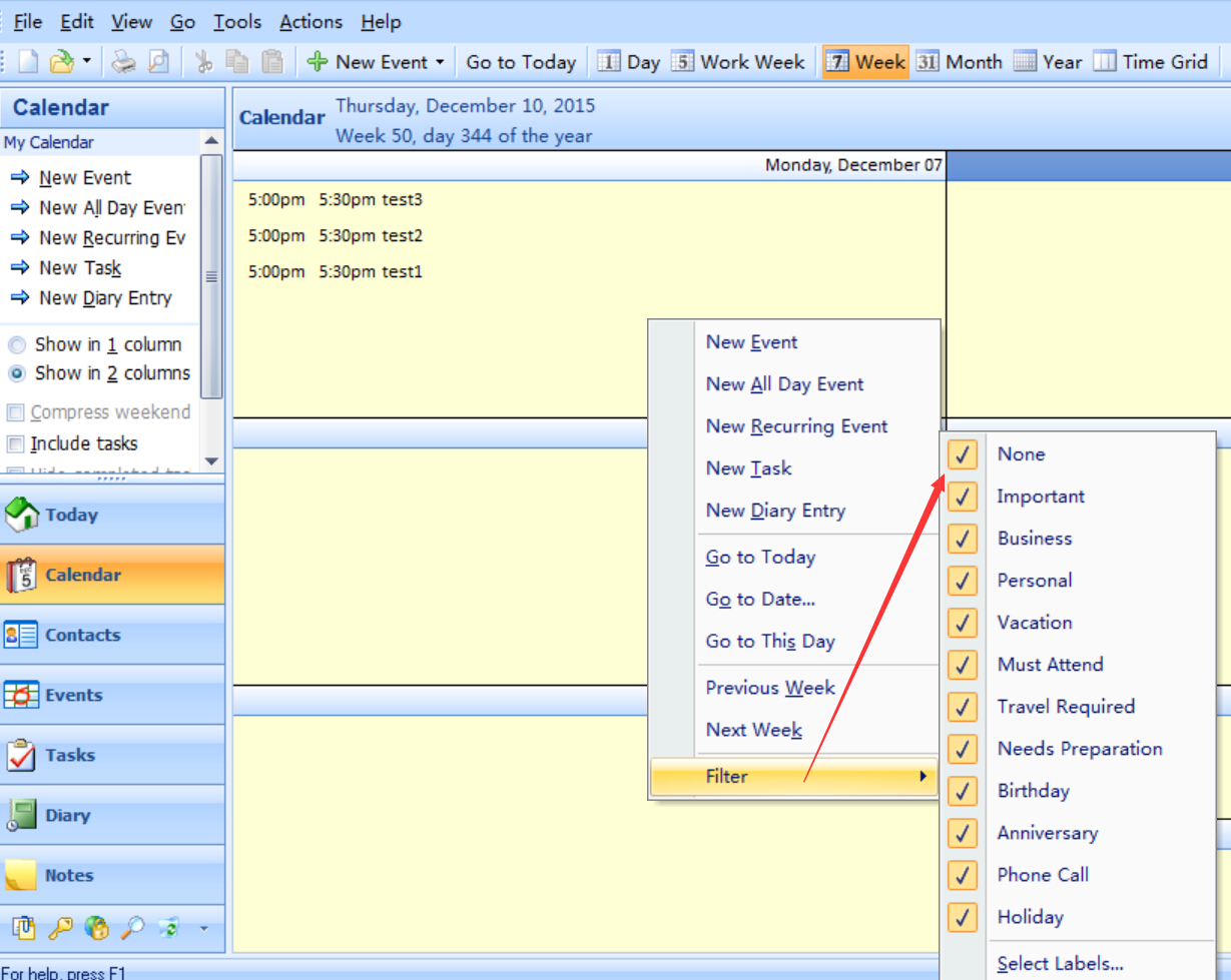 Note: Events can be shown in calendar view, as well as tasks list (if we have marked the checkbox of "Include tasks"). If the events have not been listed in calendar view, do not worry, that is because we have made filters: Just right-click in the calendar view--> choose "Filter"--> then choose "None" is OK.