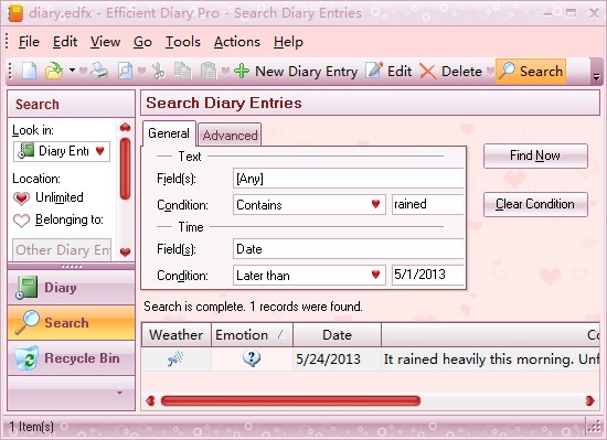 - When you want to aftertaste your past, you can find them quickly on the top of navigation panel. Or you can click Search button on the navigation panel to enter the Search module. After you input any information about the diary entry in the text box of Condition, our software will present the related diary entries for you.