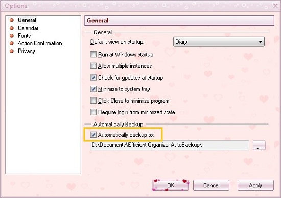 - For privacy, you can set a password for your file by clicking the Password command on the File menu. Furthermore, you can backup your file in case losing. Click Option command on the Tools menu and select Automatically backup to in the General option. Or click Backup command on File menu to backup one file directly. Certainly, you can restore your file by clicking Restore command on File menu.