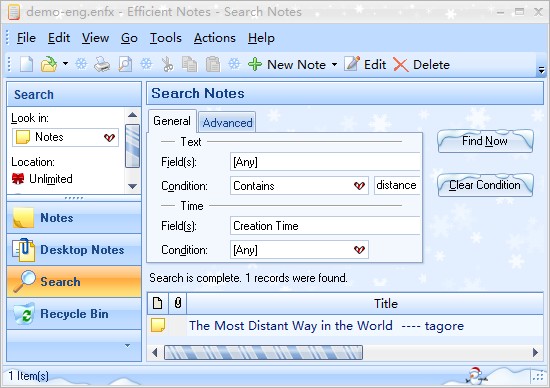 - When you want to search your notes, please click Search button on the navigation panel or click Search on Toolbar. After you input any information about the note in the text box of Condition, our software will present the related notes for you in the Search module.