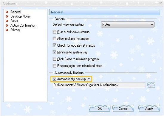 - For privacy, you can set a password for your file by clicking the Password command on the File menu. Furthermore, you can backup your file in case losing. Click Option command on the Tools menu and select Automatically backup to in the General option. Or click Backup command on File menu to backup one file directly. Certainly, you can restore your file by clicking Restore command on File menu.