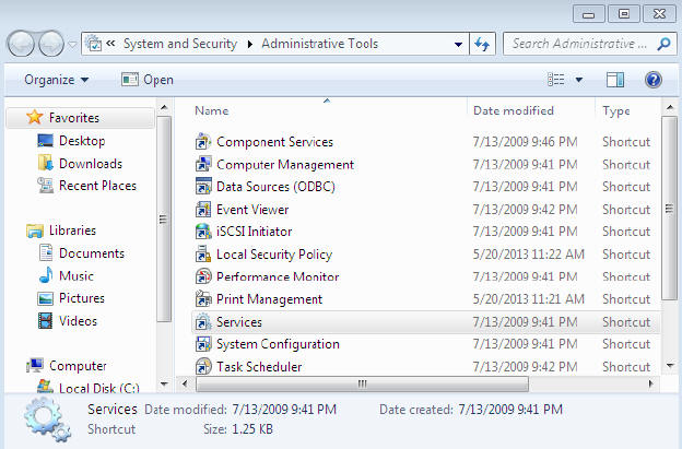 - Open the 'Control Panel' on your computer, and then click System and Security--> Administrative Tools--> Services.