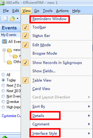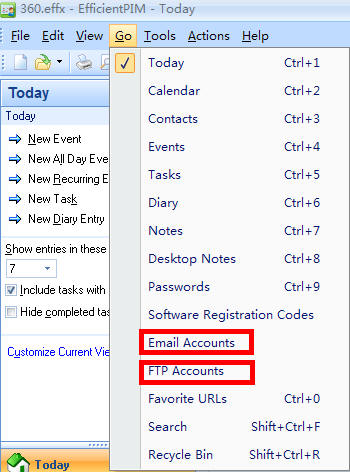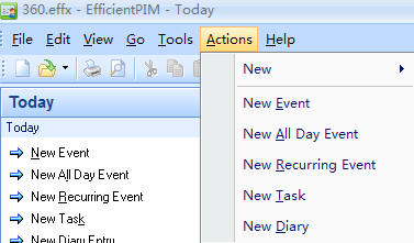 Menu, which always stands at the top of software, is one of the most important part of software. When people use software for the first time, being familiar with menu is an absolutely step. As you can see from the above, it contains File, Edit, View, Go, Tools, Actions and Help. Here will introduce options as shown below, not everyone, but those you will use often. And also will put few links for detailed introduction of some. (Tips: there is a little difference of options shows under File, Edit, View, Go, Tools, Actions and Help between EfficientPIM and other efficient software, also between one module and other modules. Here all the pictures took from EfficientPIM except one from Efficient Sticky Notes.)
