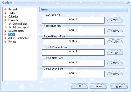 Please click Options on Tools menu, and then click Fonts on the left of the Options window so that you can change the fonts of six main parts of EfficientPIM.