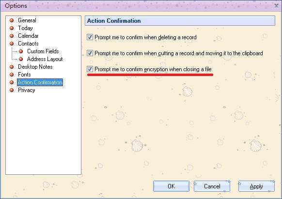 - Please click Options on the Tools menu, and then select Prompt me to confirm encryption when closing a file in the Action Confirmation section.